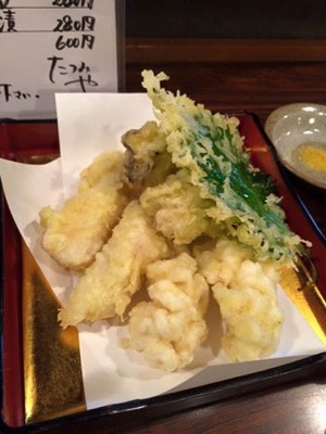 白子、カキ、鳥の天ぷら盛り